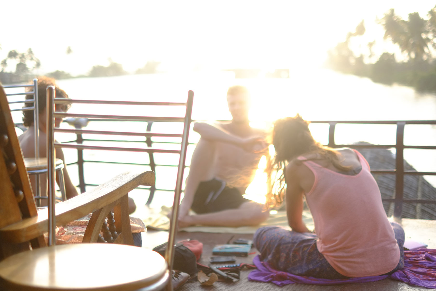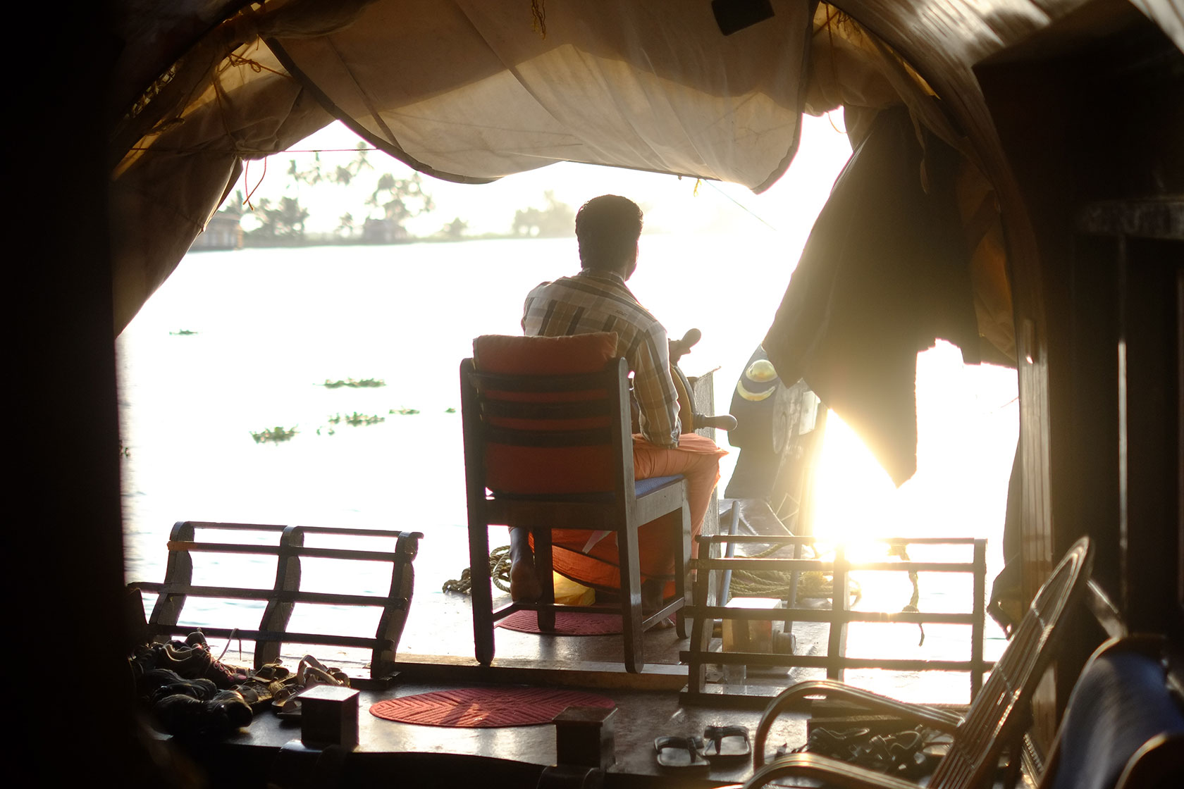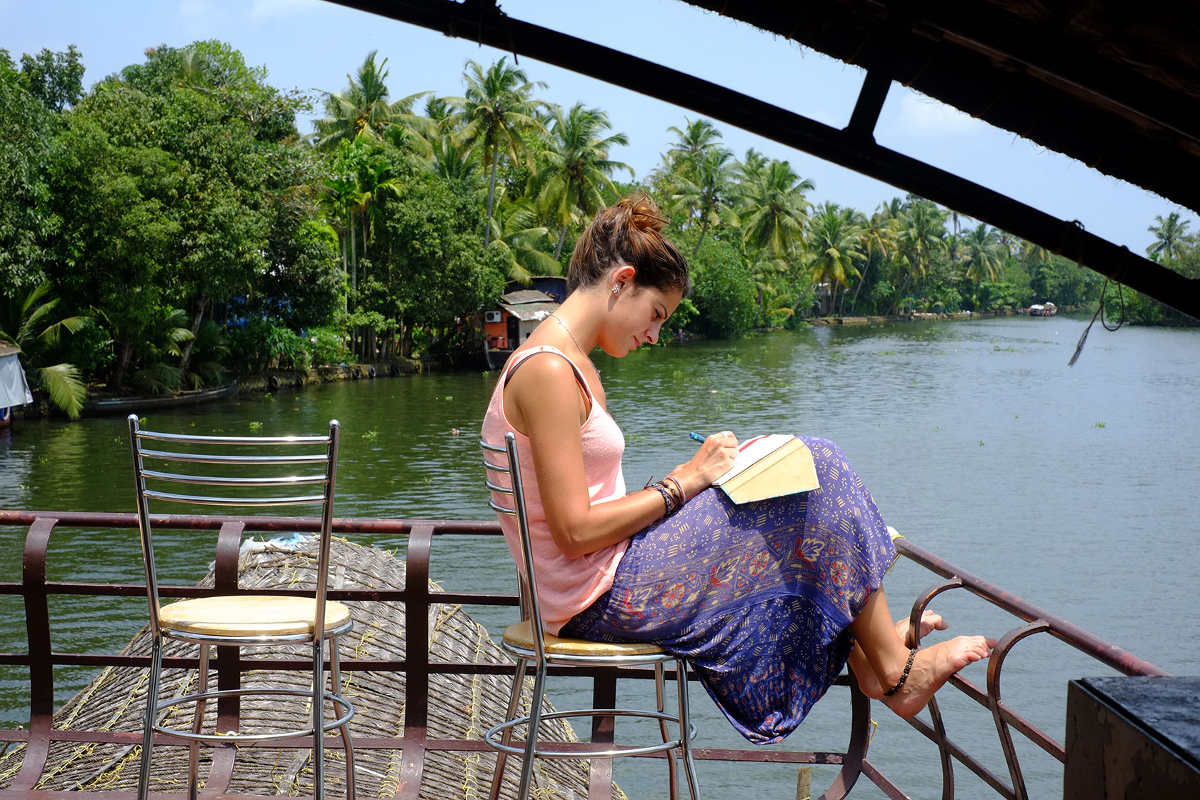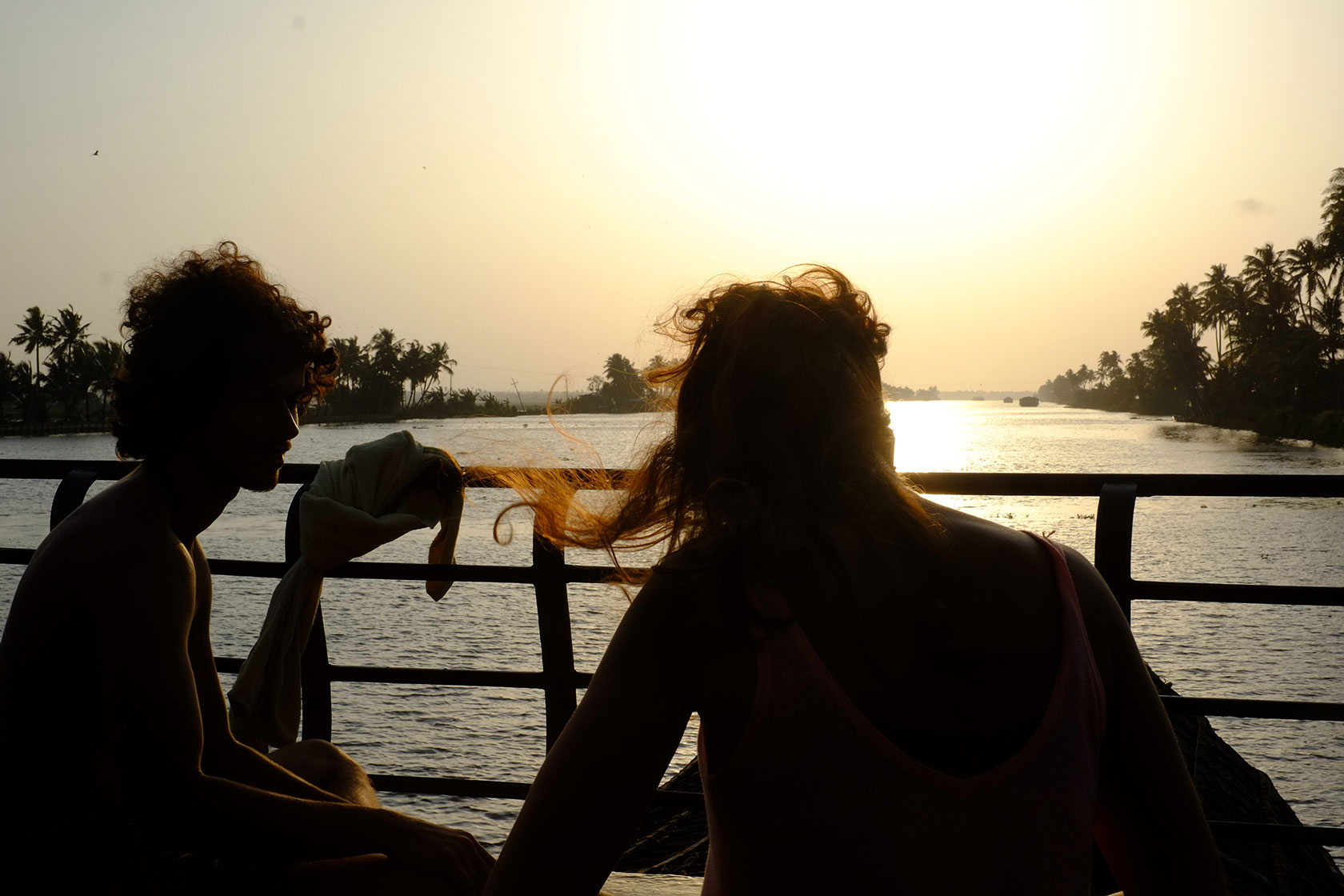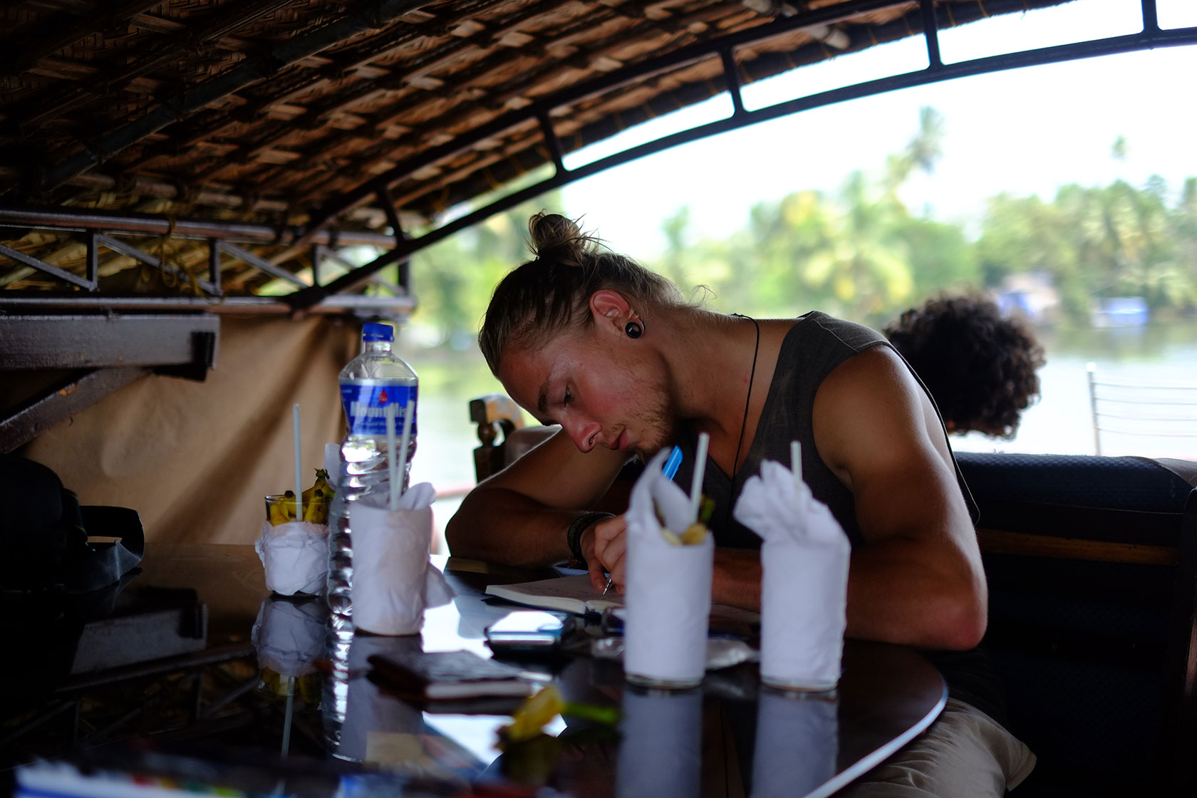 direction north, but I met a group sympathetic Austrians and Spanish girls, and so I decided spontaneously to join their itinerary and travel to Allapey. There we rented a houseboat with driver, cook and chill-out area and explored the famous backwaters of Kerala. The atmosphere was extremely relaxed and everyone went to his creativity in the form of painting, wood carving and writing. The evening we enjoyed with a horrible tasting coconut brandy, which we transformed with honey, lime and sprite to a more or less drinkable cocktail. Life is great!