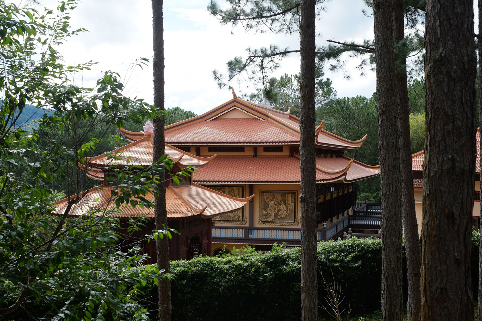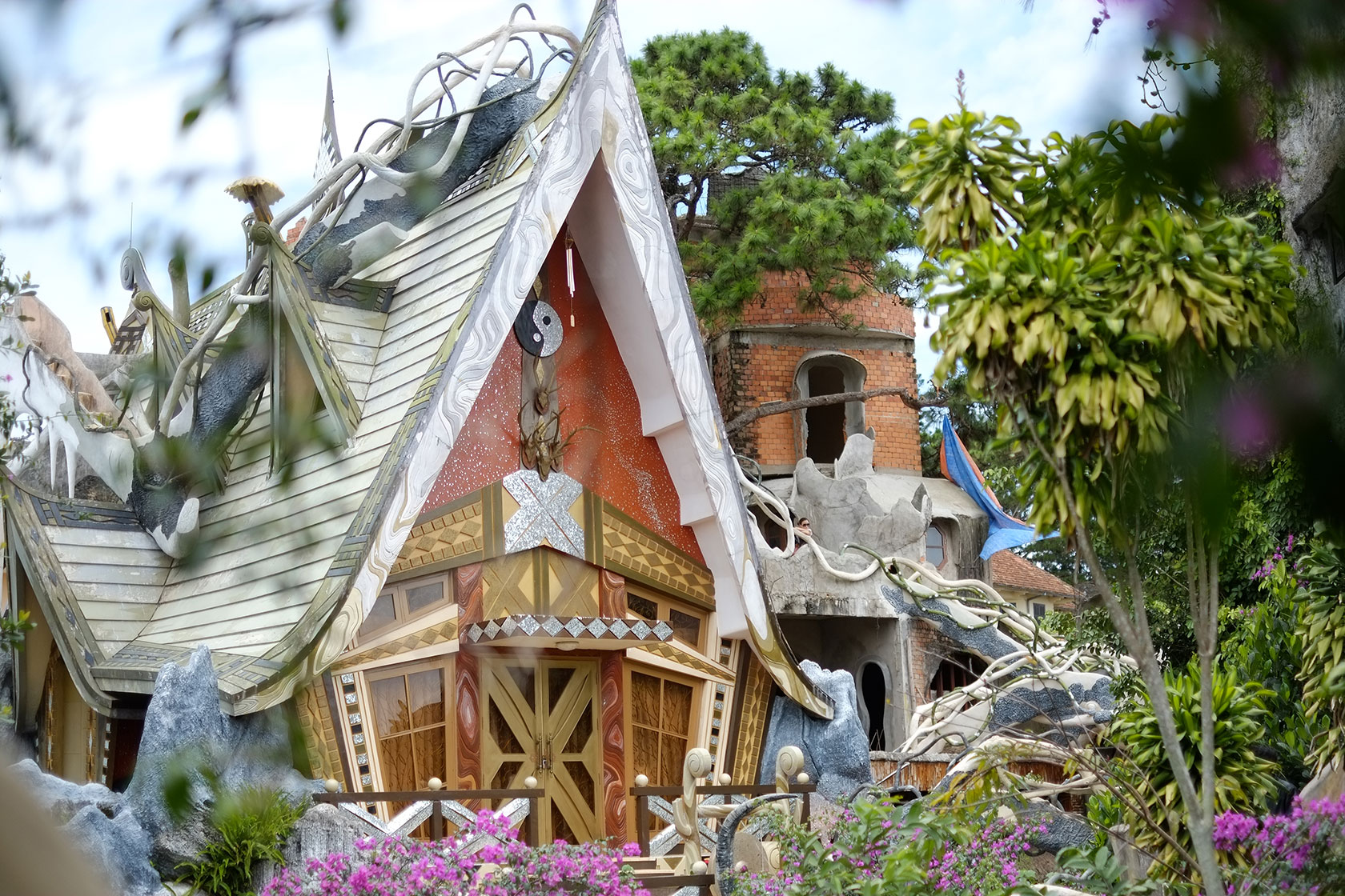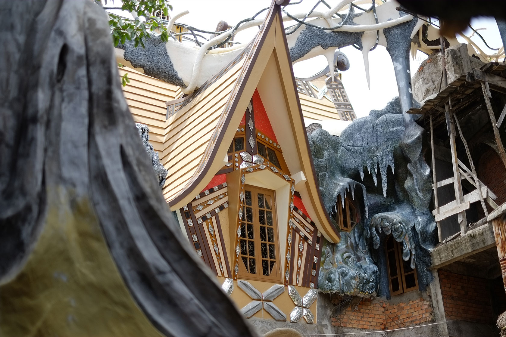 Dalat is nestled between mountains and forest and very popular by vietnamese people as a honeymoon destination. After about 19 hours bus ride we arrived tired the small town in central Vietnam. With the rented motorcycle we explored the region and discovered the so called „Crazy House“, which was created in 1990 by the designer Dang Viet Nga. A architectural style, you can not assign to these structures. The interior of the building consists of caves, winding corridors, winding staircases, strange furniture and whimsical life-size animal statues. Straight and right angle forms do not exist. We felt us like Alice in Wonderland. Just